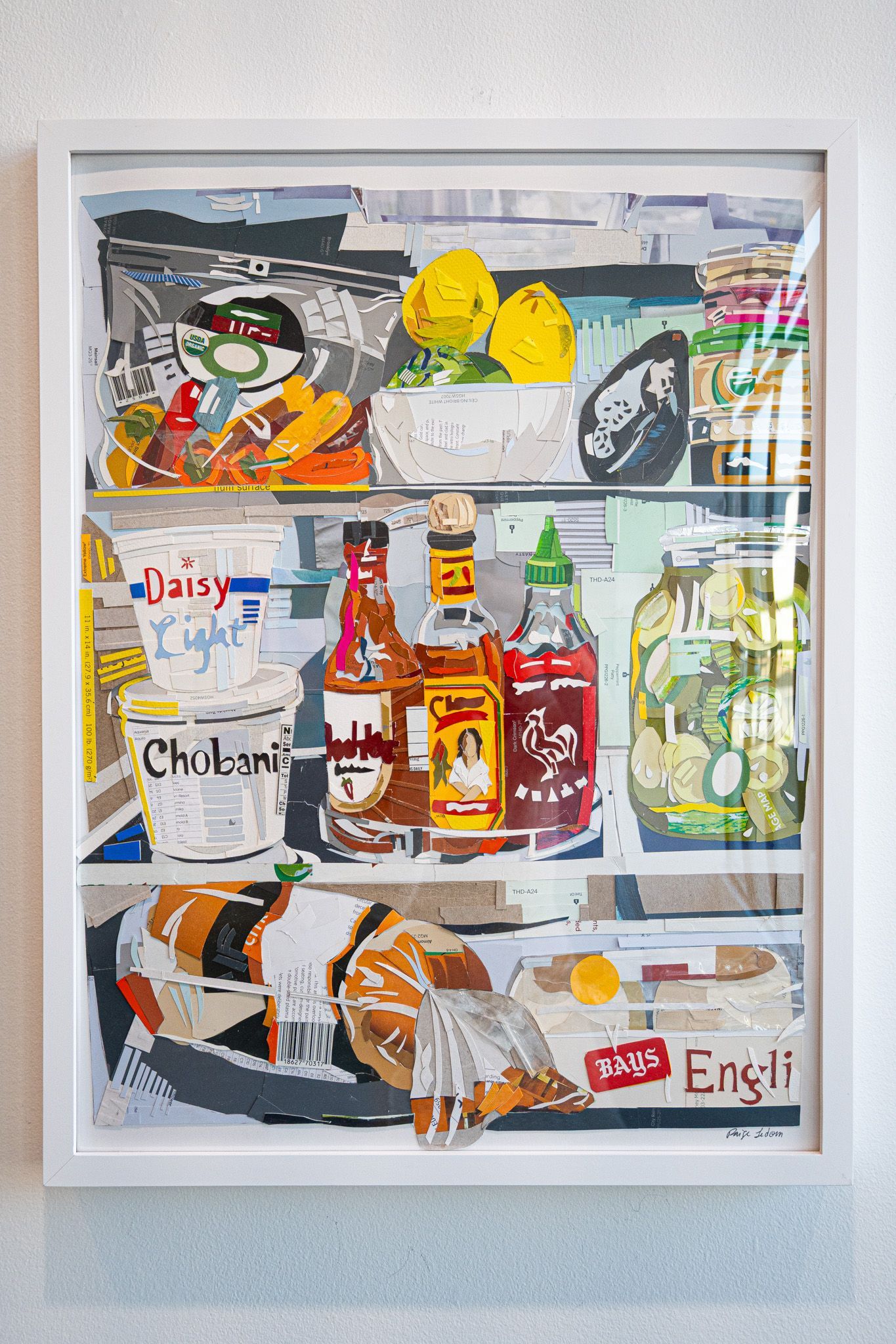 Line - a mix of sharpe, angular lines and soft, curved edges that mimic the forms of various grocery items. The layering of paper cutouts creates implied lines, guiding the viewer's eye across the shelves.
