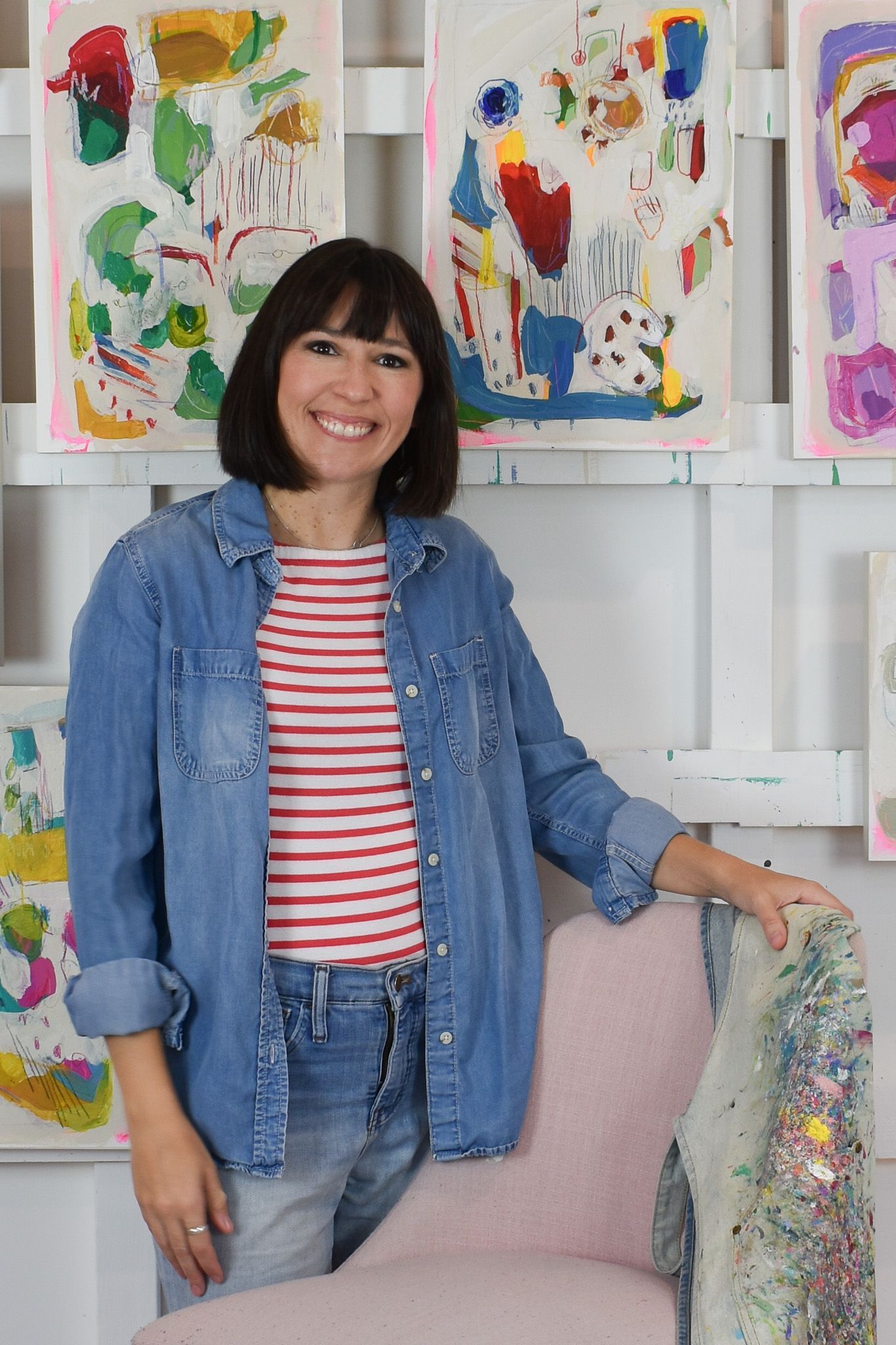 Daisy begins each piece with a photo for inspiration, often drawn from interior design. In her studio, she creates a calm and focused atmosphere, usually starting with a cup of tea and some soothing music—favorites include First Aid Kit, Brandi Carlile, and Taylor Swift—allowing her creativity to flow naturally. Once her surface is prepped, she begins with an underlayer of neon pink and builds abstract shapes inspired by her reference images. The process is intuitive: she adds, subtracts, invents, and eliminates elements that aren’t working, always searching for patterns and simplified shapes to incorporate. Daisy typically works from dark to light, layering paint and frequently scraping with a palette knife to reveal the colors beneath. The final layer features pastel accents, a favorite part of her process, and she carefully balances the composition to feel fun and carefree while maintaining harmony—never letting it become too over-the-top or chaotic.