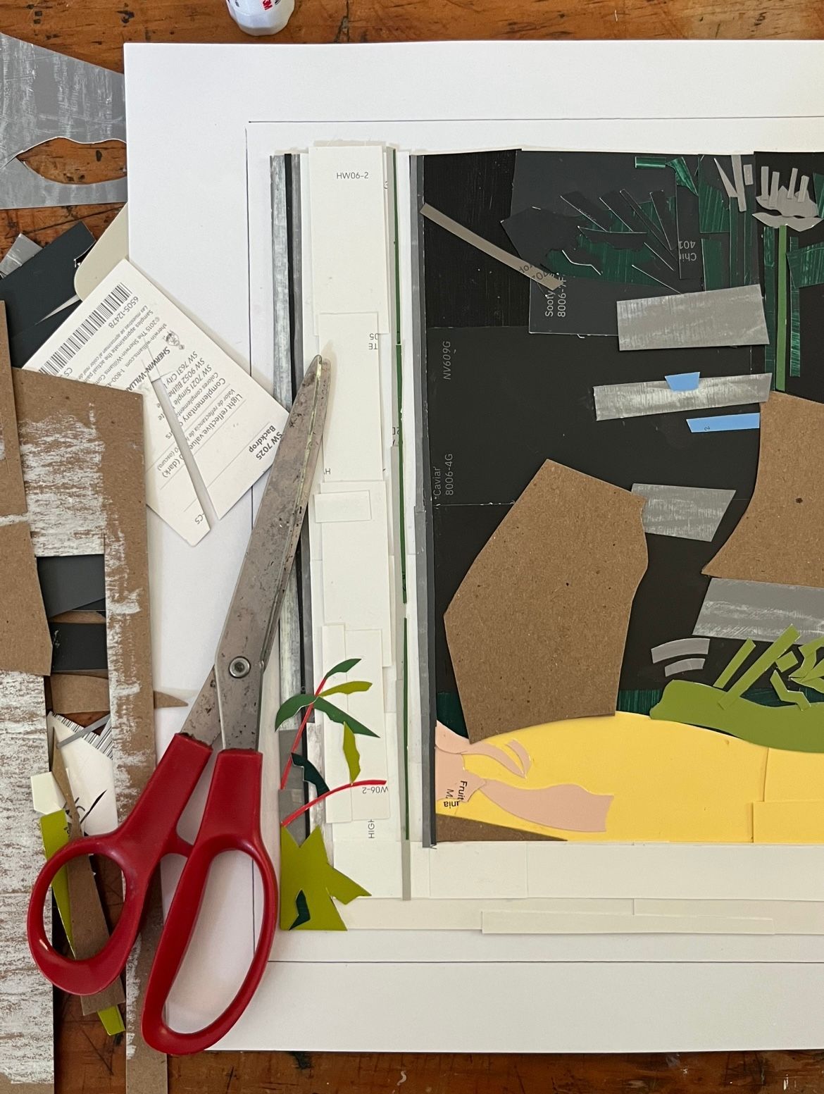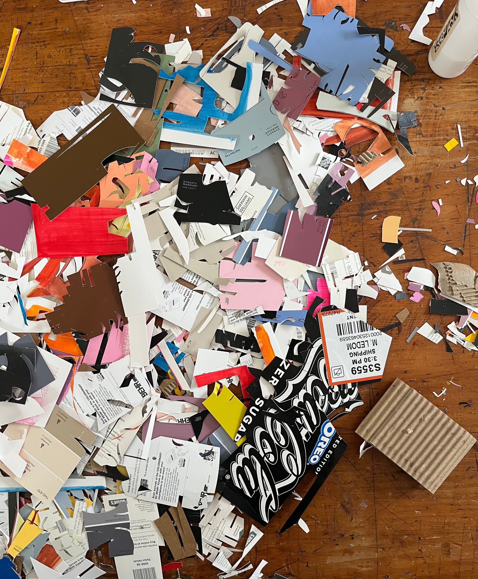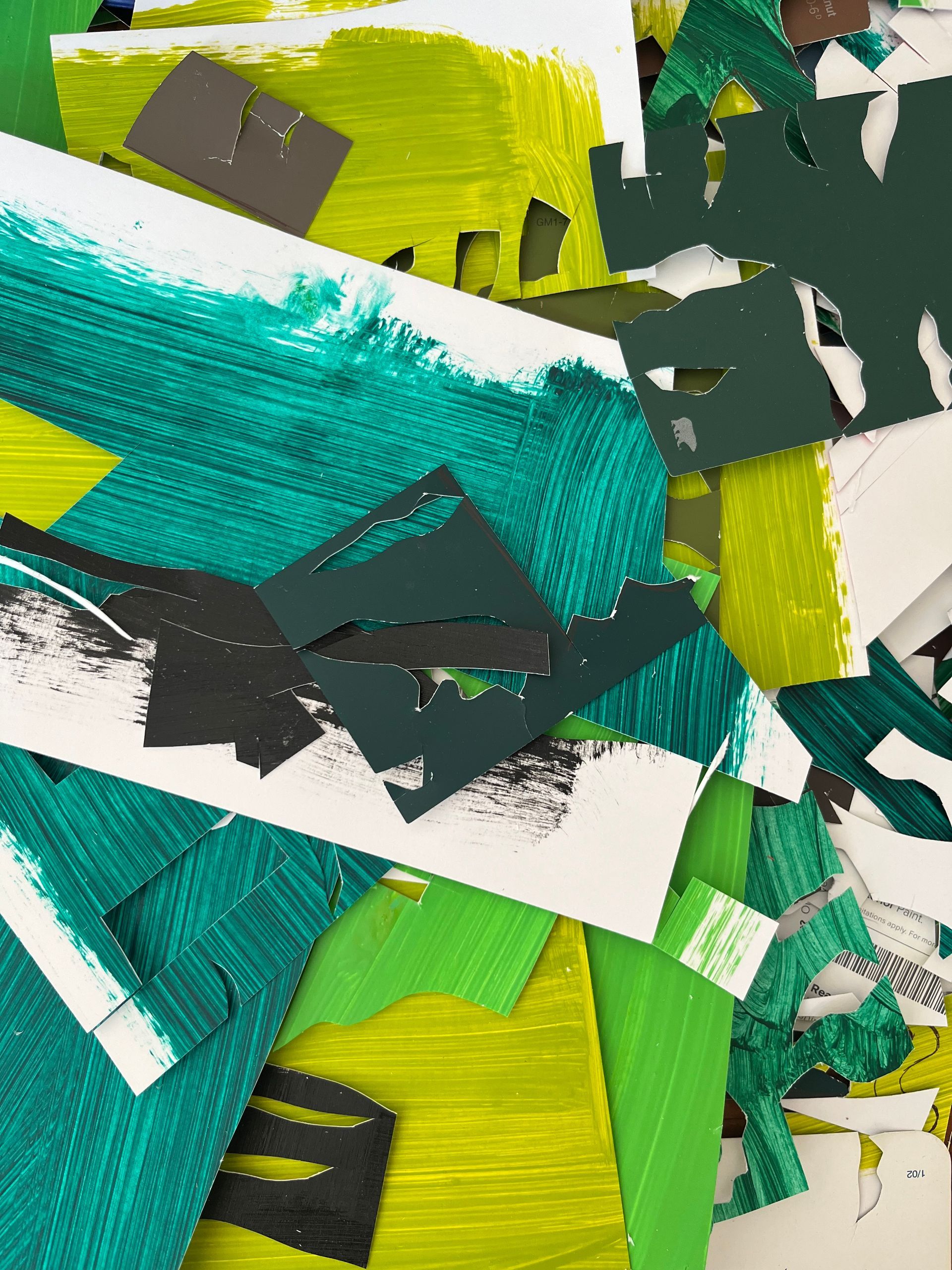 While paint swatches have become her material of choice, she has utilized many physical bits and scraps of her own personal life into her work like cut-up paintings from teaching, brochures from travels, handwritten notes, diet coke boxes, and even photography she has shot.