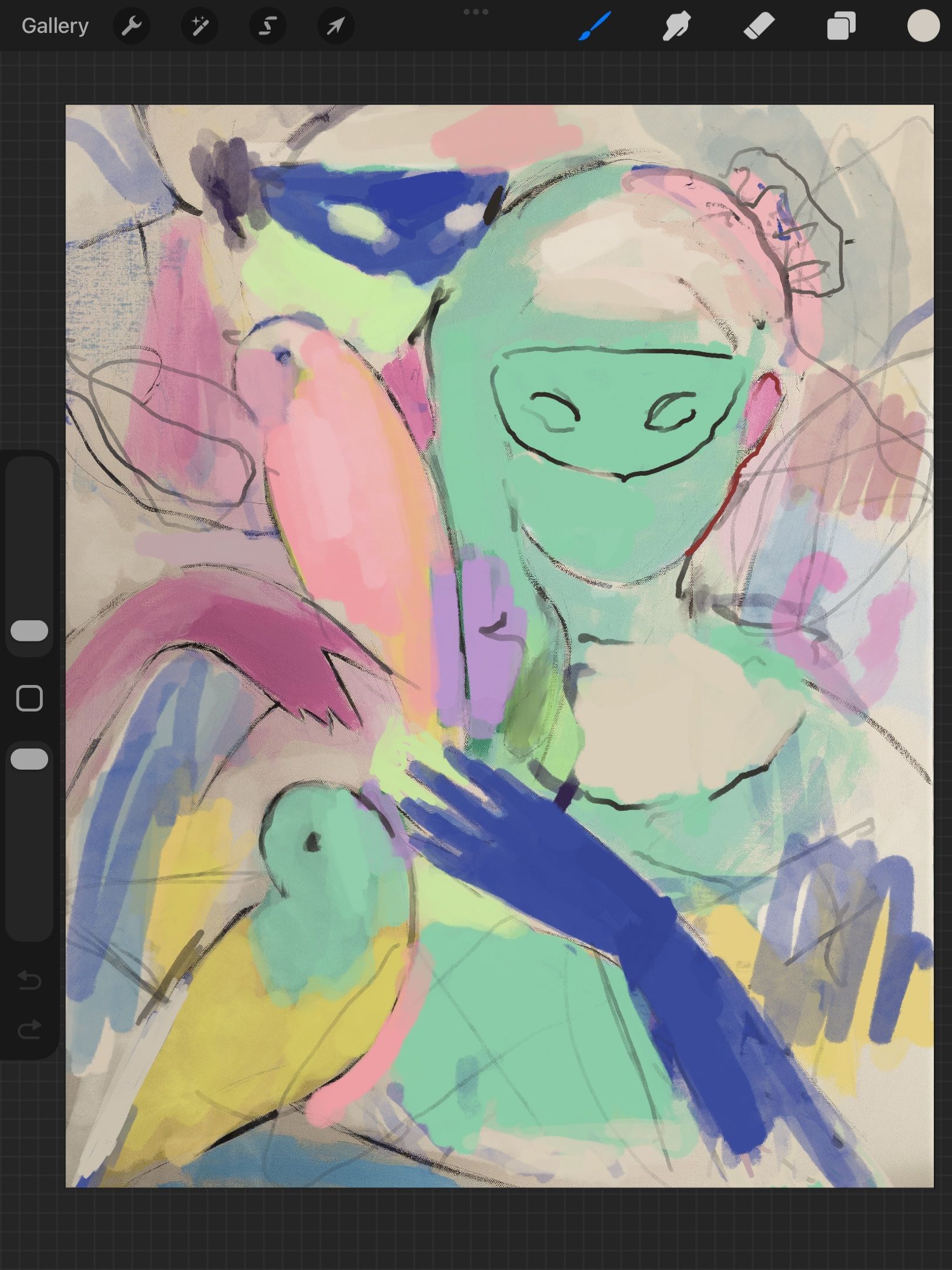 "Here I try to make sure the underlying structure is somewhat accurate to how I want the final piece to look, but I don't get too fussy with smaller details. Sometimes I'll do a charcoal drawing on the final canvas and use a photo of that as the starting point for the digital piece, which is what I did with Columbina. Next, I'll do the final painting. For Columbina, this process was to transfer the underlying drawing to the large canvas, and rendering the painting while making various changes."