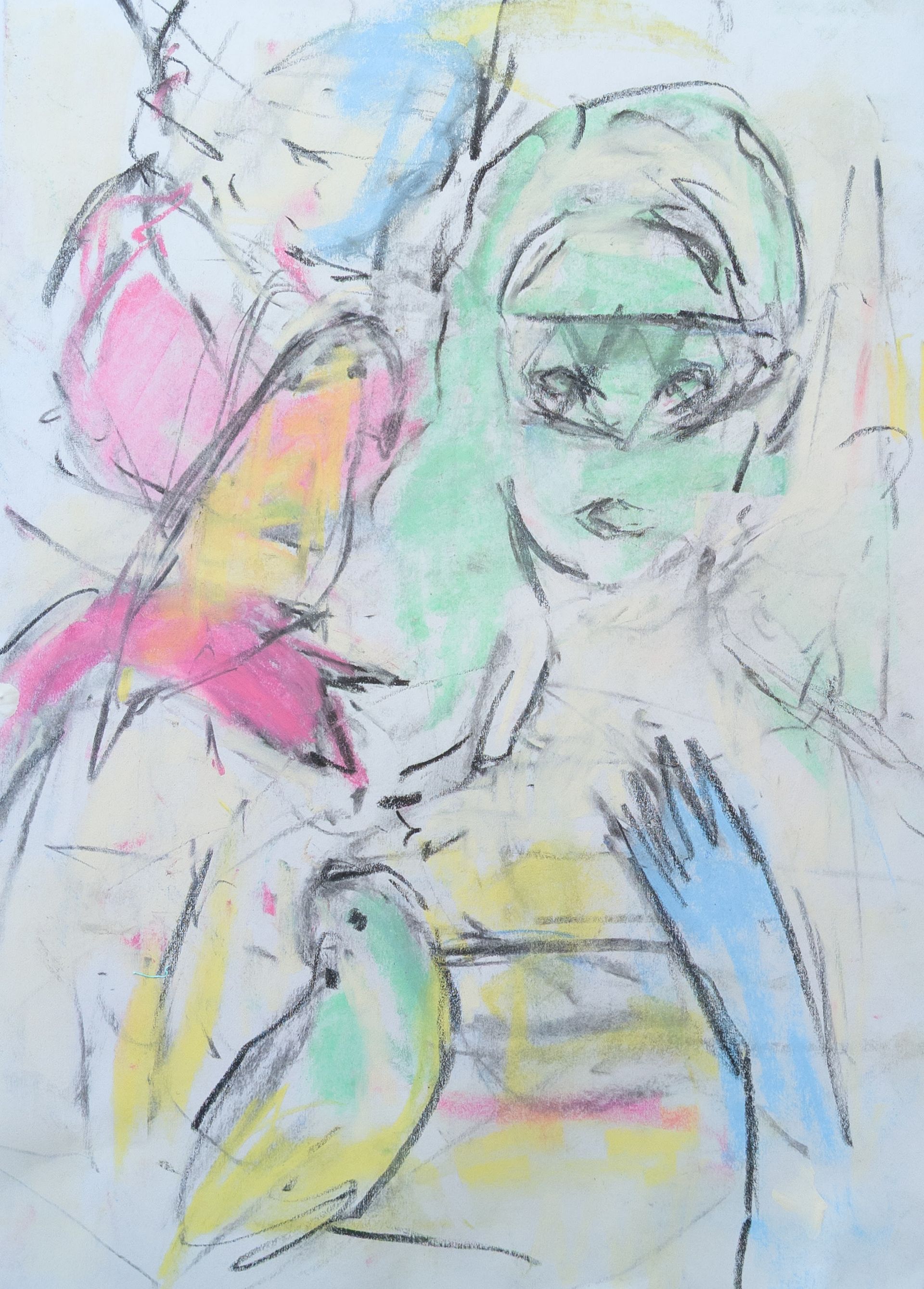 "I usually use vine charcoal, dry pastel, and pencil on paper, and they're usually small (about copy paper size).The three green ceramic figure pieces come from a series I worked on last year. I was exploring the aesthetics of slate chalkboards, building up textures to mimic the quality of overwritten marks. At the same time I wanted to work on painting complex porcelain subjects, and use the painting medium to give them a surreal, uranium glass texture. Garden No. 3 and No. 4 combine those ideas."