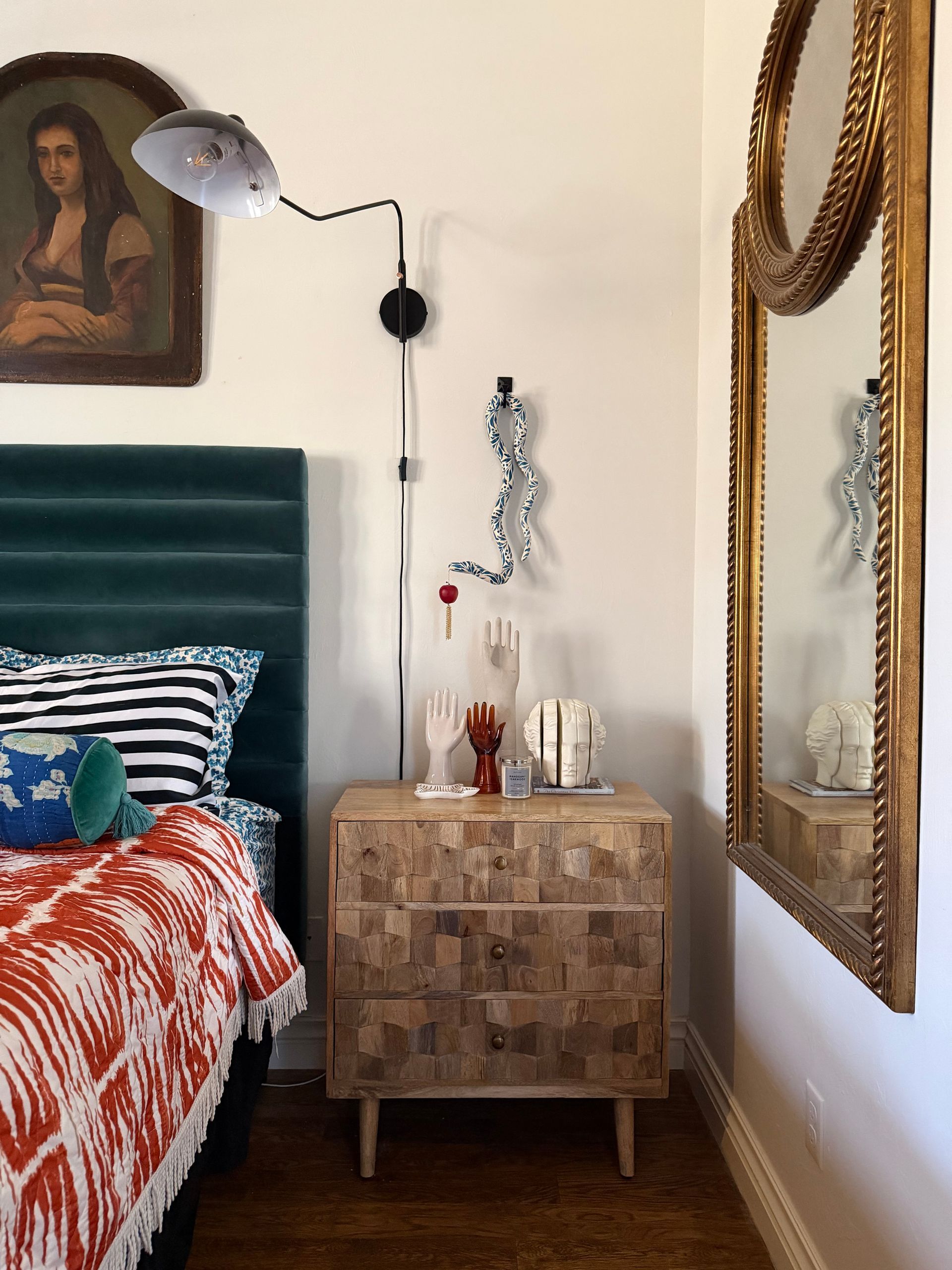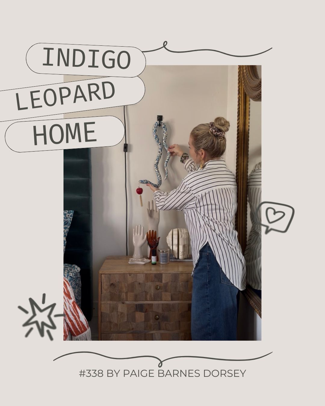Sarisa Muñoz of @indigoleopardhome is known for her fearless approach to interiors, or what she calls, “no approach” at all. Rooted in eclectic maximalism, Sarisa designs her home by instinct... collecting pieces simply because she loves them rather than worrying about "where will they live?" or "what will they match?". Her home celebrates color, pattern, and personality, making her a natural fit for Paige Barnes Dorsey’s whimsical sculptural snakes.