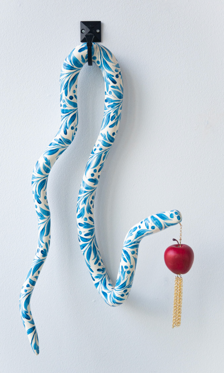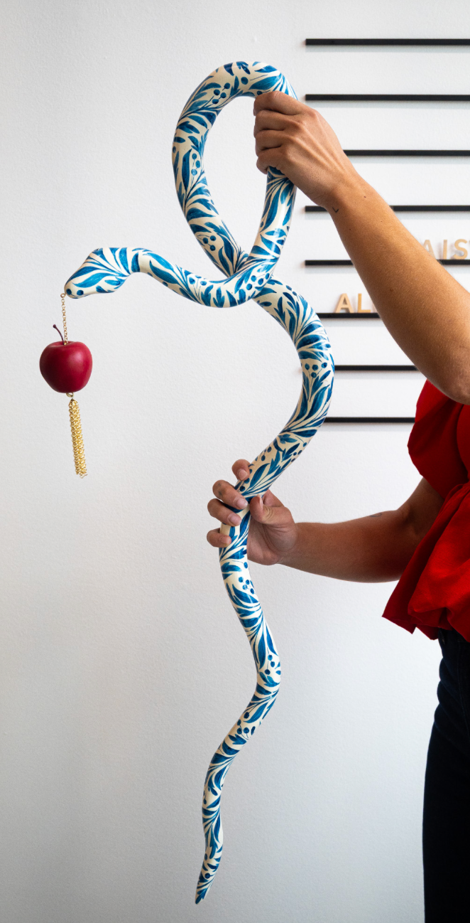 Gifting Sarisa one of Paige’s hand-sculpted snake pieces felt like an obvious pairing. Paige is a self-taught mixed media artist based in the Deep South, Paige creates modern heirlooms that blend Southern tradition with playful irreverence. Each snake is individually sculpted and hand-painted, ensuring every piece is entirely unique. Inspired by the Garden of Eden in this series, as well as the duality of beauty and danger, her “Garden Party Snakes” combine refined, china-like ornamentation with the symbolism of a creature long associated with both temptation and transformation.