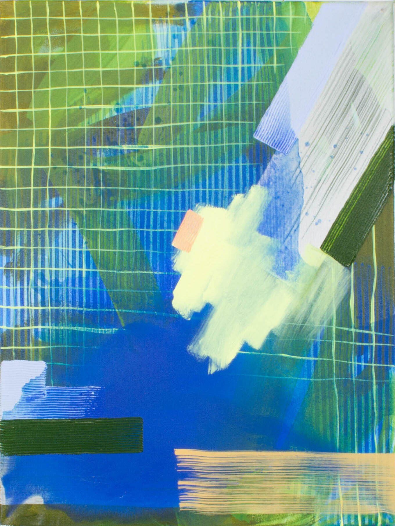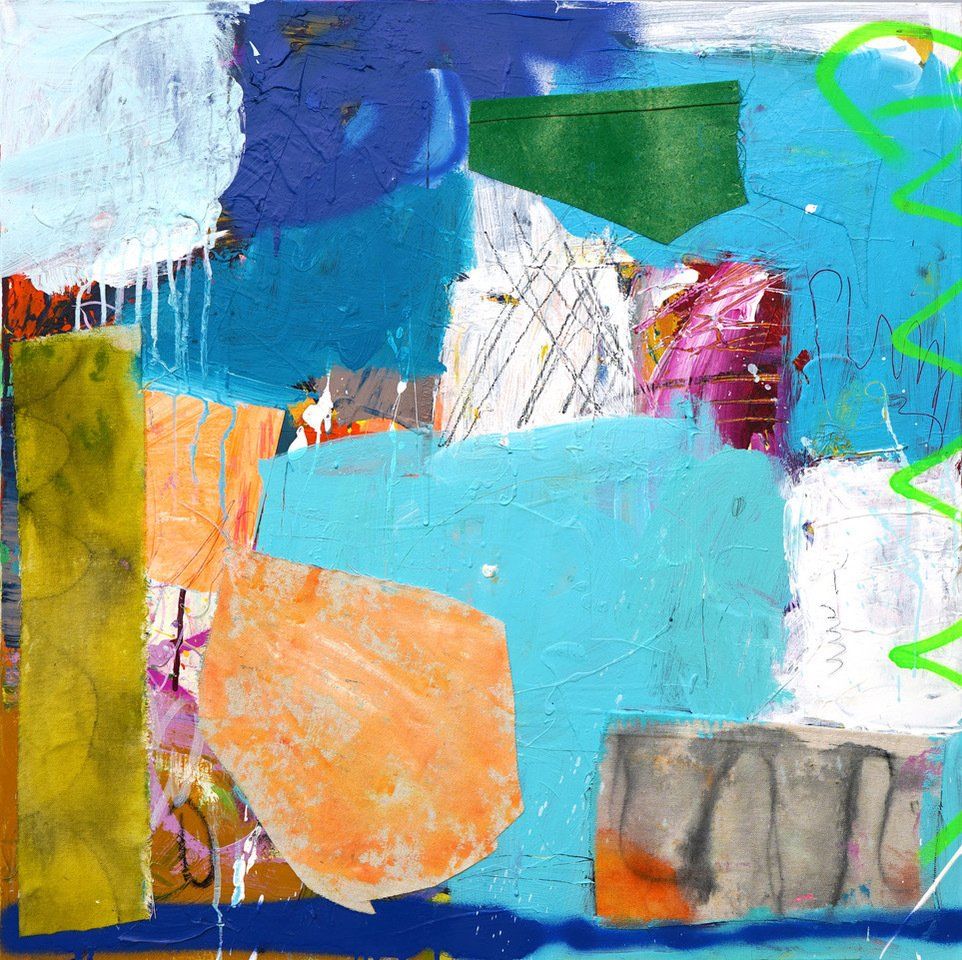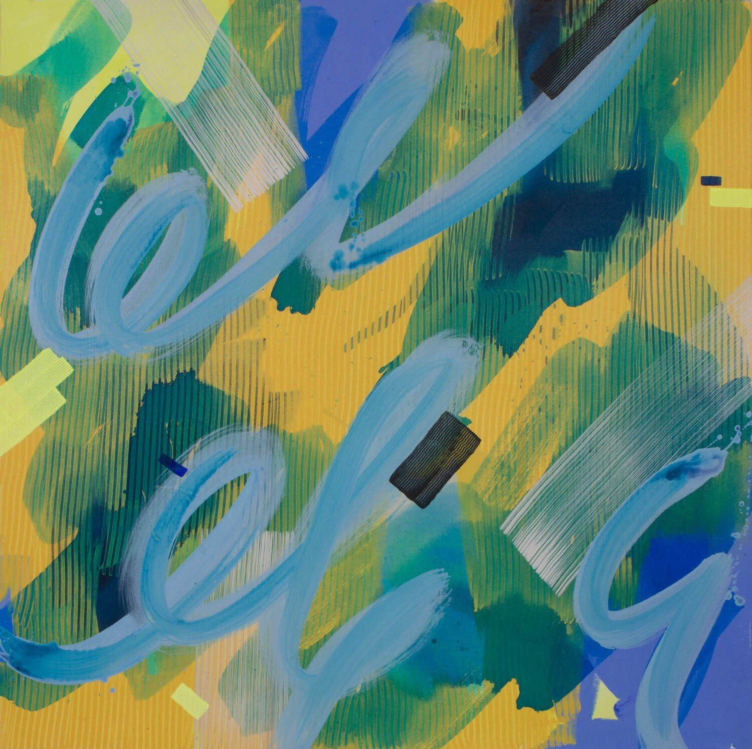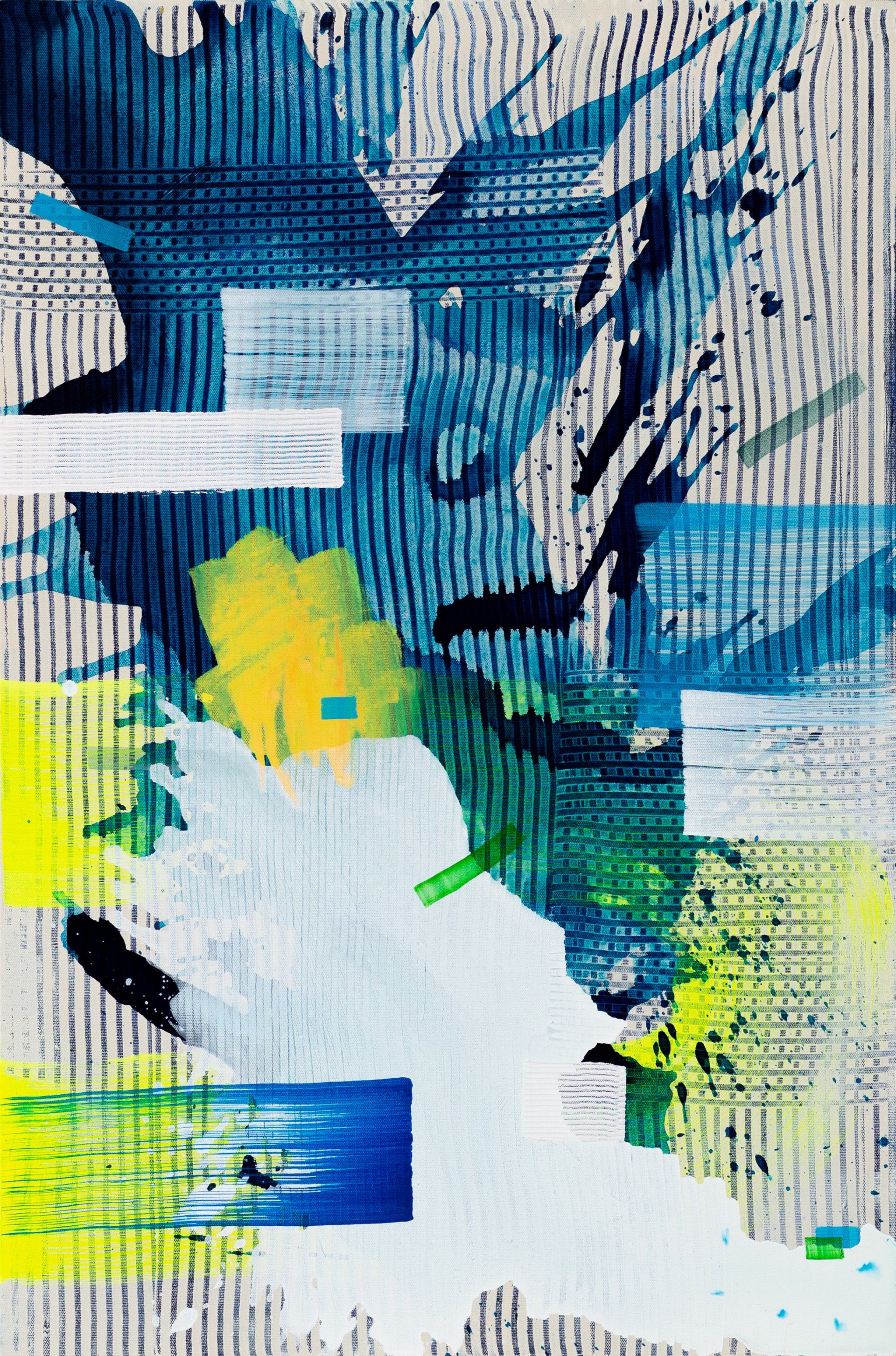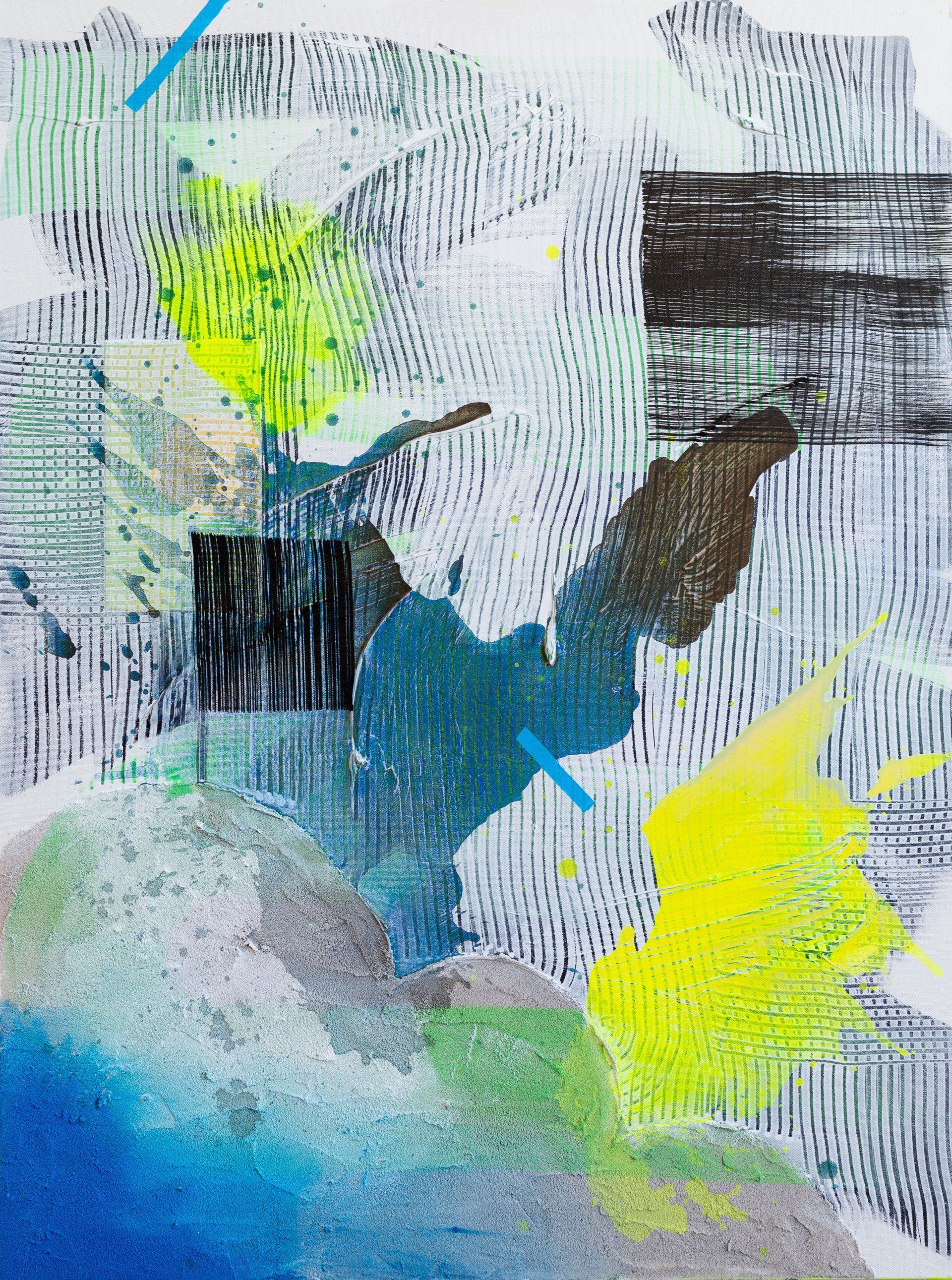 Acrylic, ink, spray paint, embroidery and fabric on canvas
